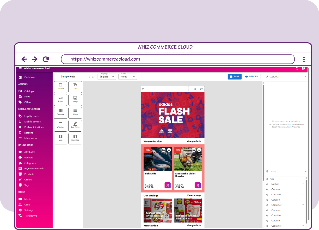 Discover the fun in no-code app development with WHIZ COMMERCE CLOUD's drag & drop interface. Customize your mobile eCommerce app by adding or removing features effortlessly.